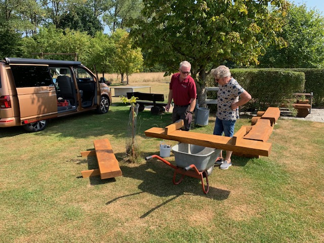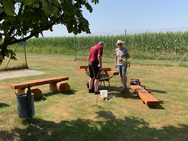 Selbstverständlich legen wir großen Wert darauf, unseren Flugplatz stets in einem einwandfreien Zustand zu halten. Leider sind unsere Sitzbänke mittlerweile in die Jahre gekommen, daher erklärte sich unser zweiter Kassierer Jürgen – ein äußerst versierter Tischler – bereit, neue Bänke anzufertigen. Die Holzarbeiten erledigte er in seiner heimischen Werkstatt. Für die Montage auf dem Flugplatz fertigte unser Gerätewart Gerd passgenaue Edelstahlwinkel an und baute die Bänke gemeinsam mit Jürgen auf.