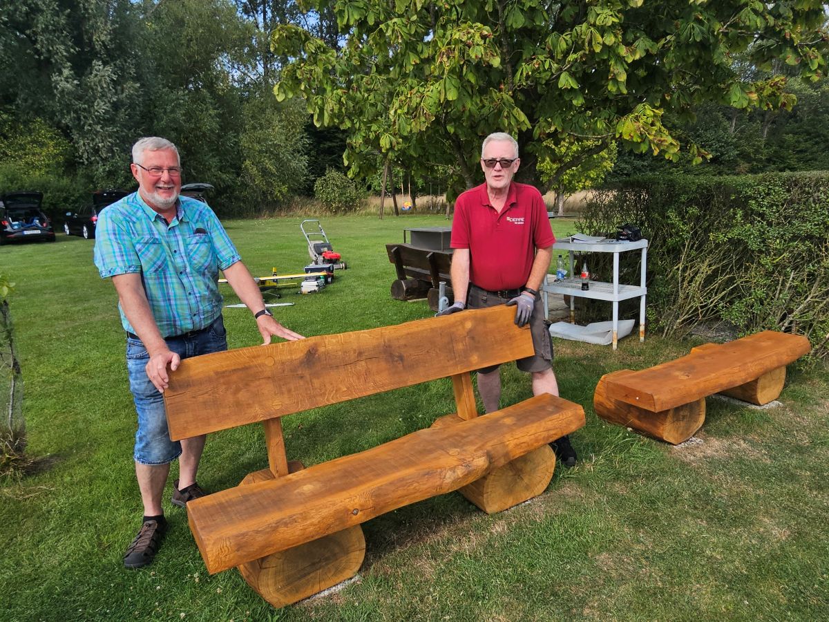 Selbstverständlich legen wir großen Wert darauf, unseren Flugplatz stets in einem einwandfreien Zustand zu halten. Leider sind unsere Sitzbänke mittlerweile in die Jahre gekommen, daher erklärte sich unser zweiter Kassierer Jürgen – ein äußerst versierter Tischler – bereit, neue Bänke anzufertigen. Die Holzarbeiten erledigte er in seiner heimischen Werkstatt. Für die Montage auf dem Flugplatz fertigte unser Gerätewart Gerd passgenaue Edelstahlwinkel an und baute die Bänke gemeinsam mit Jürgen auf.